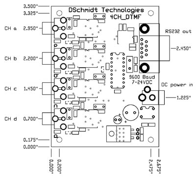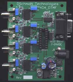 Decode up to 4 channels of DTMF audio simultaneously. Tone identities are sent out the RS232 port at 9600 baud (9600,8,n,1)